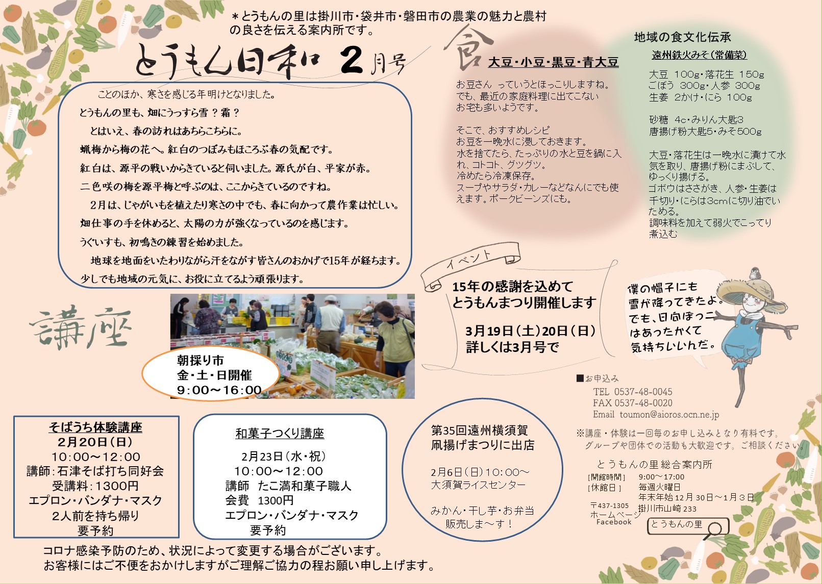 2月は、じゃがいもを植えたり寒さの中でも、春に向かって農作業は忙しい。畑仕事の手を休めると、太陽の力が強くなっているのを感じます。うぐいすも、初鳴きの練習を始めました。地球を地面をいたわりながら汗をながす皆さんのおかげで15年が経ちます。少しでも地域の元気に、お役に立てるよう頑張ります。